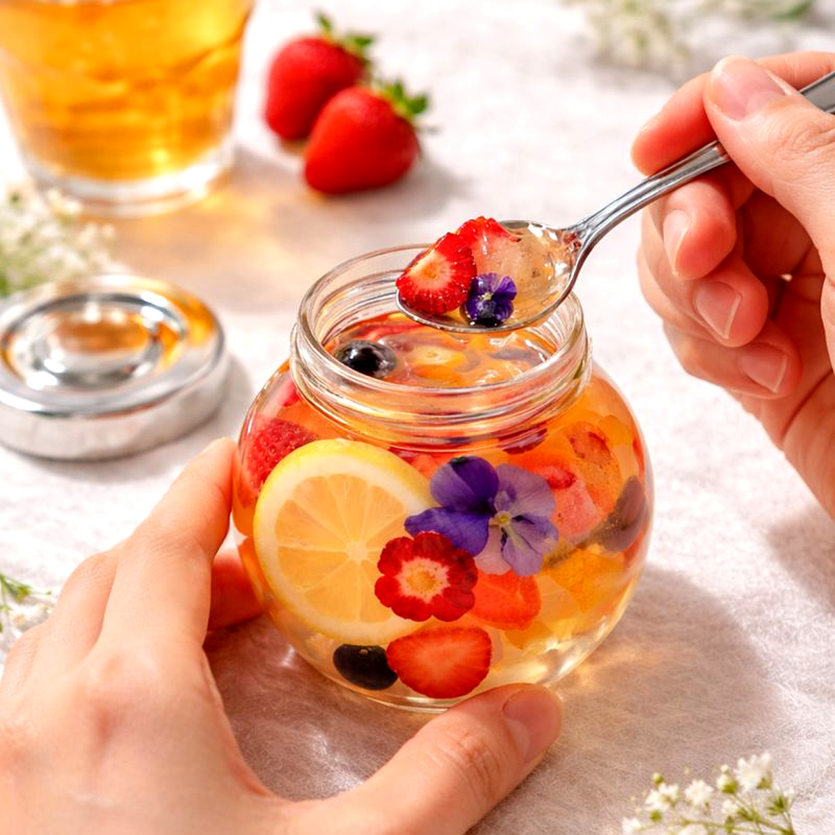 温州みかん、レモン、いちご、ブルーベリー、もも、エディブルフラワー ※各フルーツの総量は1瓶ごとに異なります ※季節により内容が変わります |